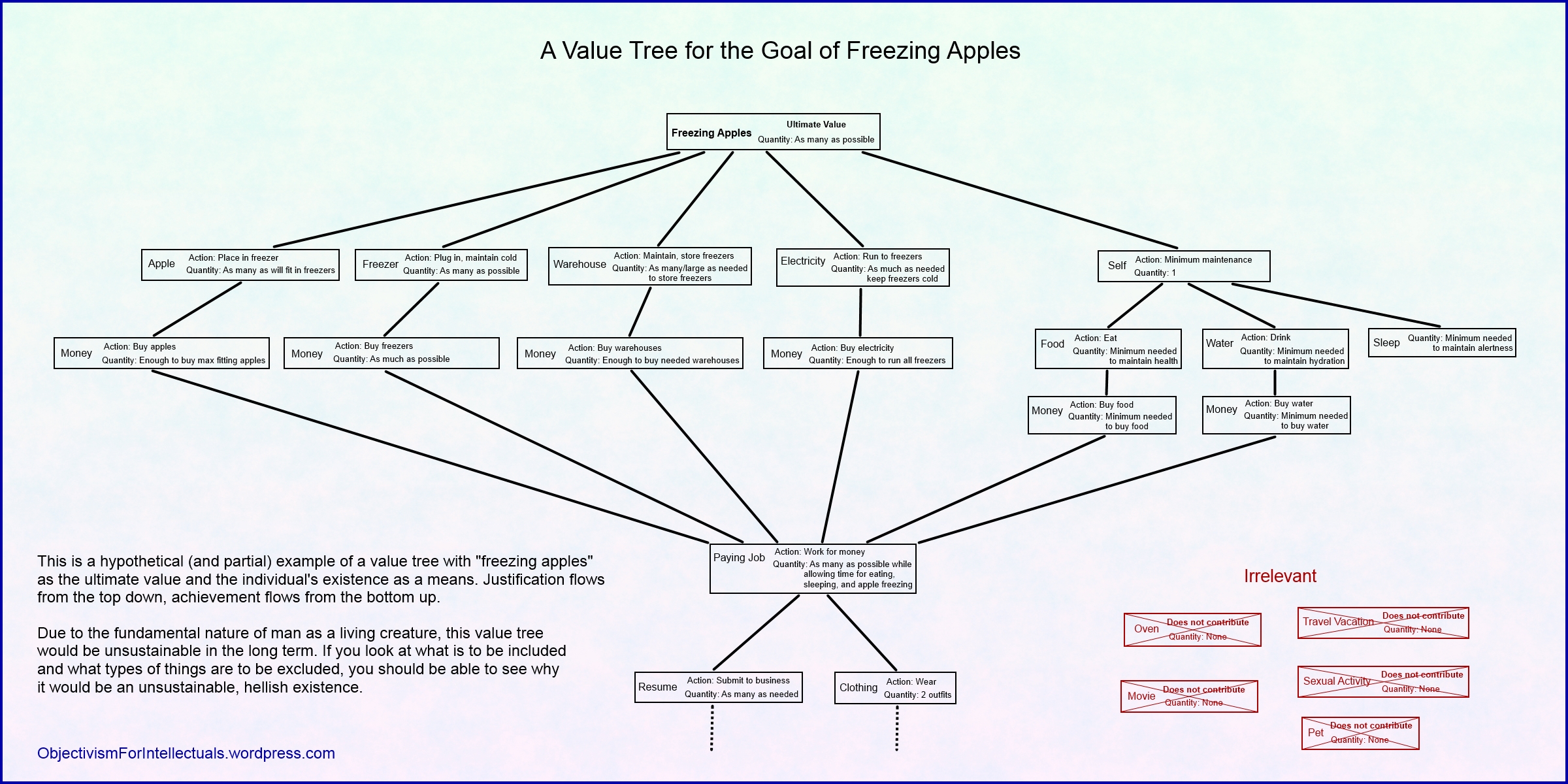 An example of a hypothetical value tree. This tree would be possible for someone to attempt, but would be unsustainable. Click to enlarge.